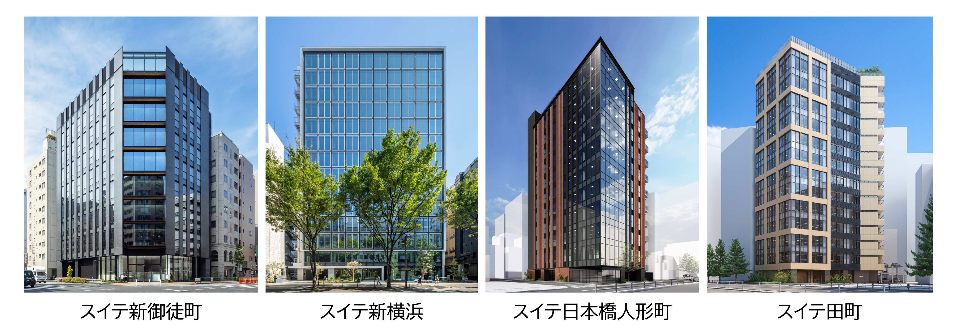 また、2027年春に竣工予定の「スイテ日本橋人形町」は、老舗商店の連なる街並みに馴染みつつ、芝居町として賑わった歴史を想起させる、幕をイメージした茶褐色のファサードデザイン※を採用しています。同時期に竣工予定の「スイテ田町」は、産学をはじめ、さまざまな人が訪れる立地特性から全体コンセプトを「多面性の合流点」とし、接道面ごとに異なる多様なファサードとすることで地域性を表現しています。
