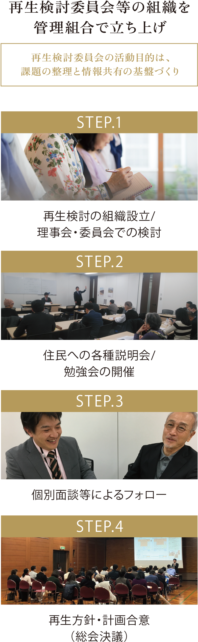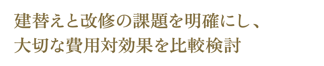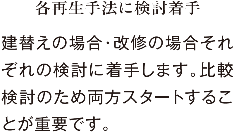 その際、初めから建替えありきで進めるのではなく、建物・組合員の現状を把握した上で、建替えと改修それぞれの課題を整理し、