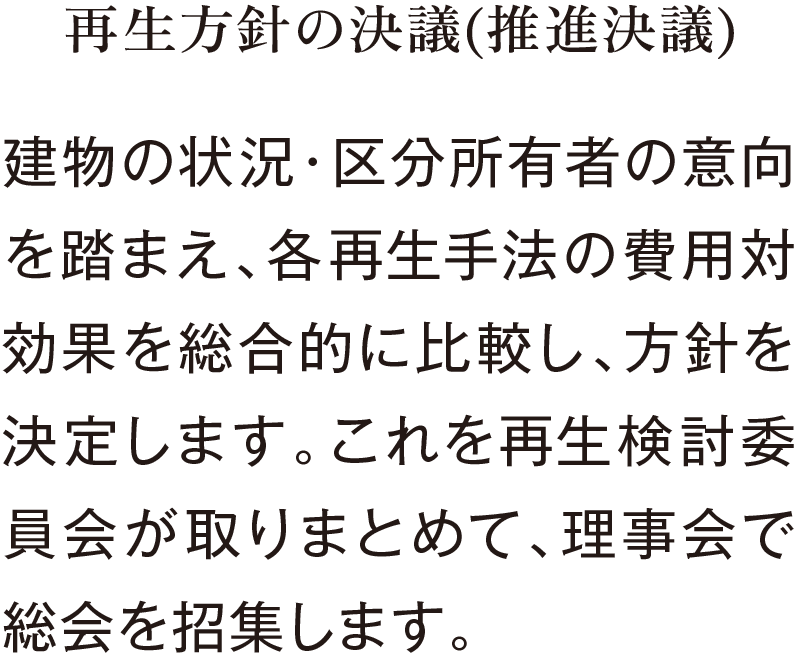 区分所有者の皆様のご要望を伺いながら、一緒に再生方法の決定へと進めていきます。