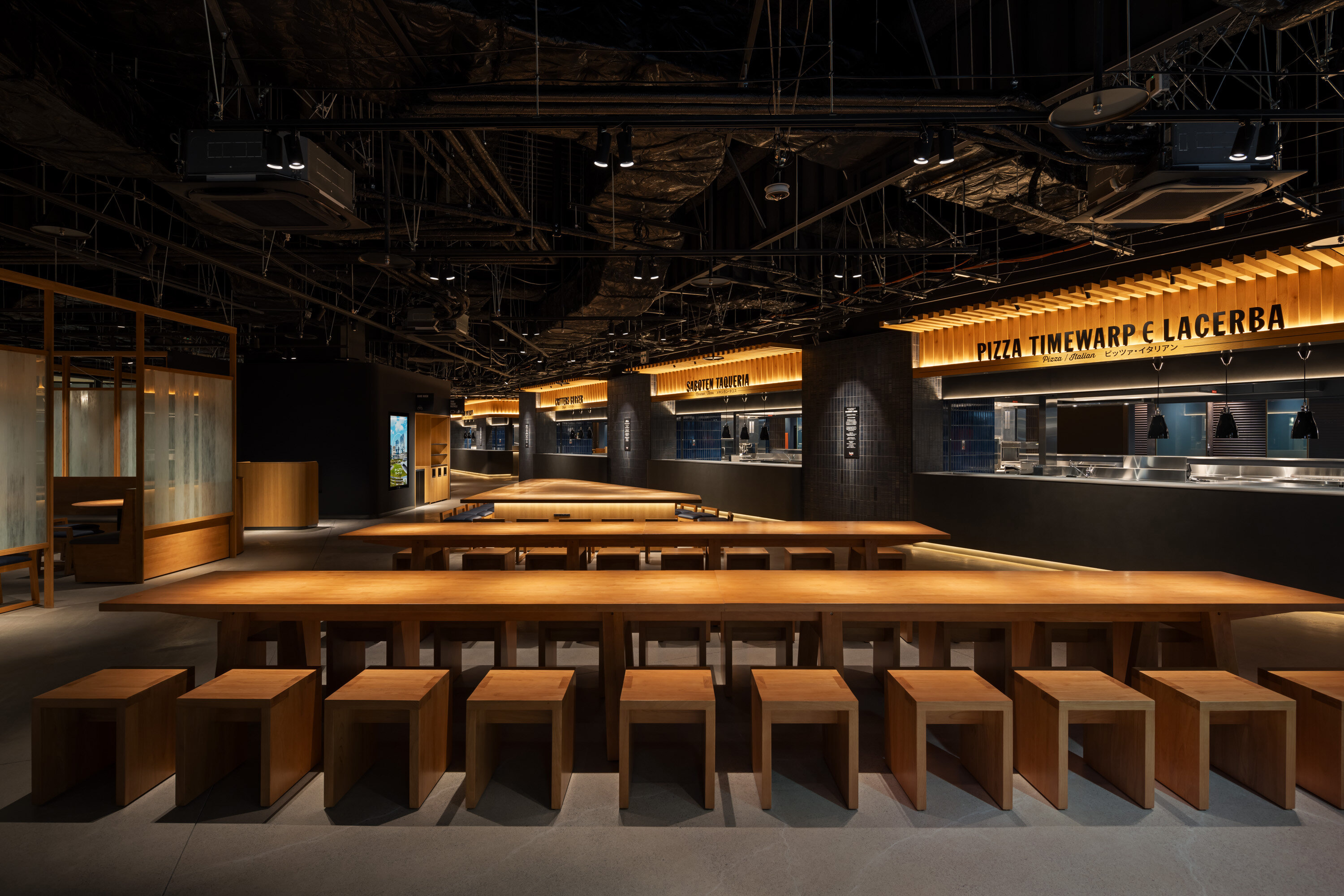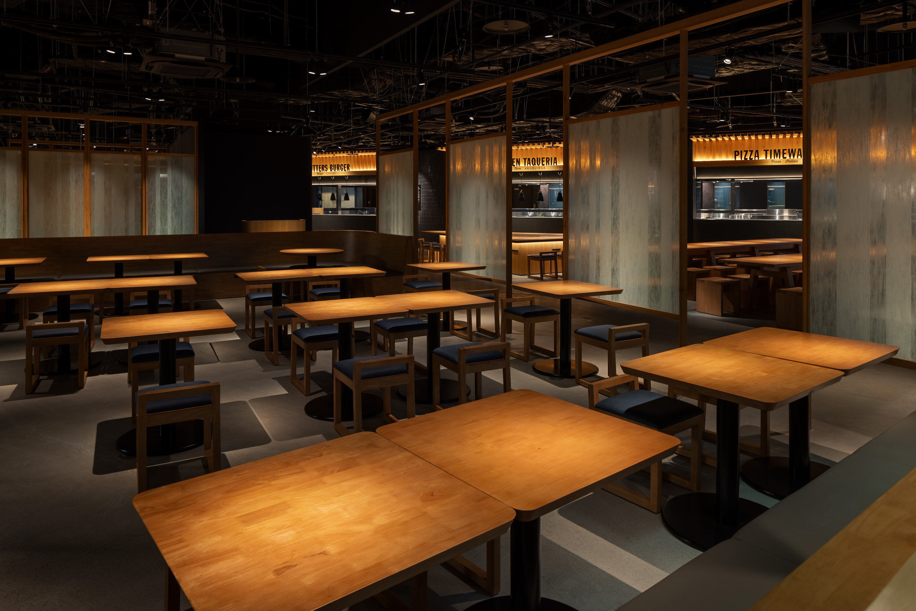 レイアウトでは、タイムアウトマーケットのコンセプトである「The best of the city under one roof」※2を体現するため、マーケットの象徴であるロングテーブルを中央に配し、各キッチンで両サイドを囲んだ構成に。また、南館内に勤務するオフィスワーカーが昼食や会食で利用することを想定し、タイムアウトマーケット初の試みとなるビジネス用ダイニングエリアを設置。現代的な障子をイメージした間仕切りで店内を柔らかく区切り、落ち着いた空間をつくり出す演出を施しています。