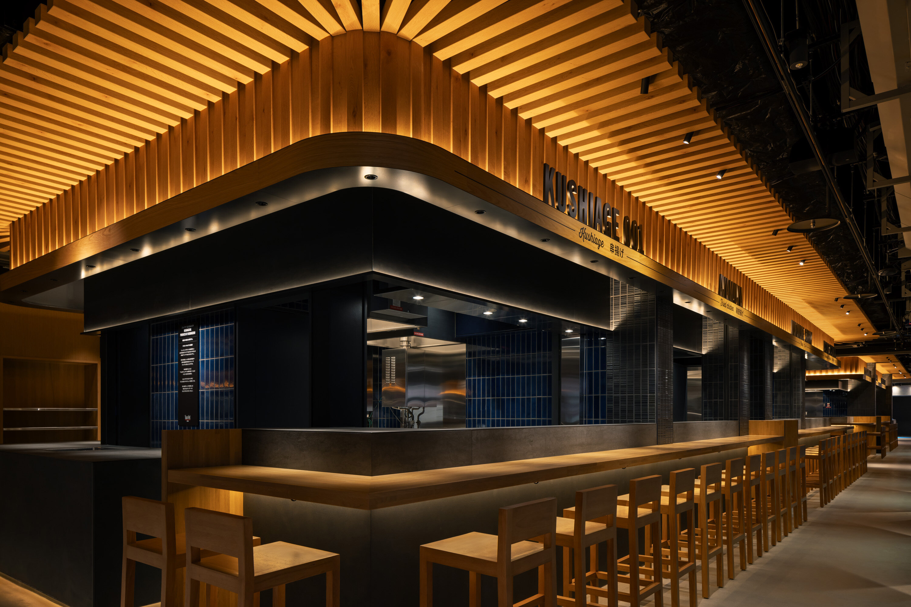 また、メインダイニングでは、無機質なメタリックルーバー※1がロングテーブルの上からステージへと伸び、そこに落ちる光によって大阪のまちが持つスピード感を表現。さらに、キッチンの外観デザインに施した瓦風タイルの鈍く光る釉薬は、集う人々のエネルギーや大阪らしい活気を映す仕掛けに。