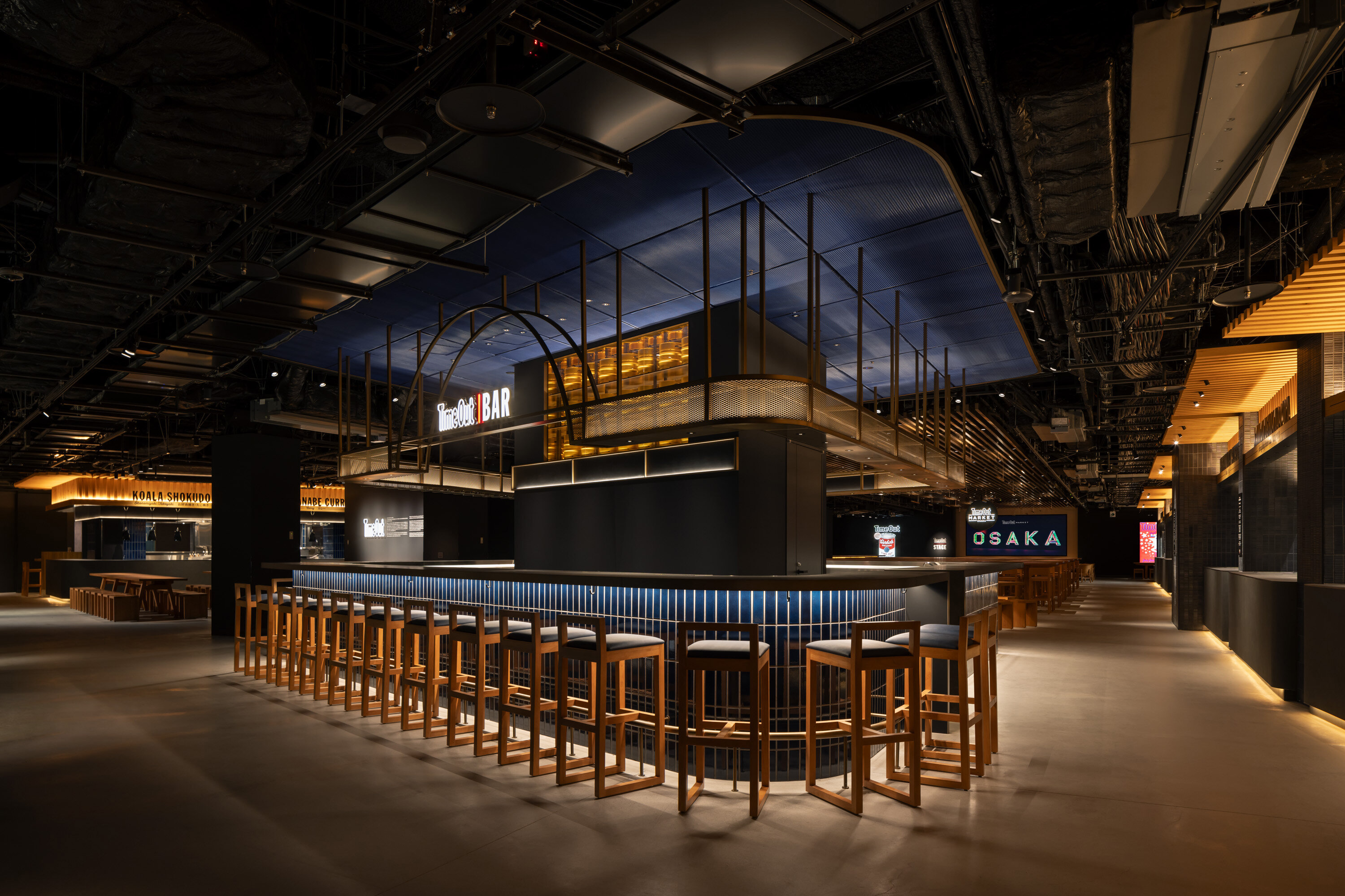 世界で展開するタイムアウトマーケットは、各都市を表現するコンセプトカラーを持つのが一つの特徴で、大阪では「ブルーモーメントの藍色」を採用しています。ブルーモーメントとは、ネオンが立ち上がる直前の時間帯に現れる色で、静けさと高揚感が共存しているこの色を基調とすることで、「これから始まる大阪」を感じさせています。