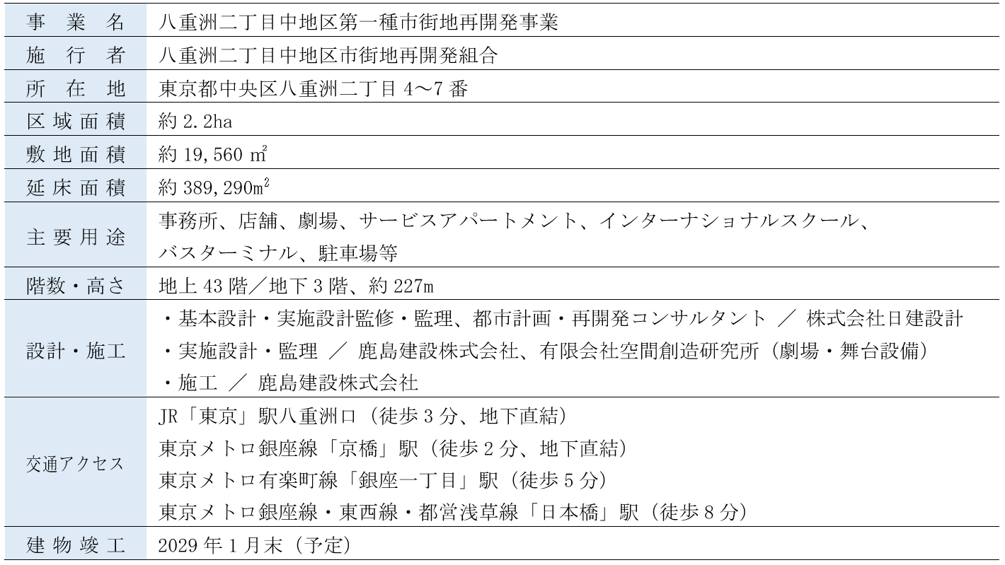 本事業は、高い交通利便性を有するJR東京駅前の八重洲エリアで進められており、都内有数の規模となる敷地(約2ha)に、JR東京駅前では最大級の延床面積(約39 万㎡)を誇るミクストユース型のビルを開発する大規模プロジェクトであります。オフィスや商業施設に加え、劇場、サービスアパートメント、インターナショナルスクール、バスターミナルなどが整備されることになっており、ビルの竣工は2029 年1 月末の予定です。