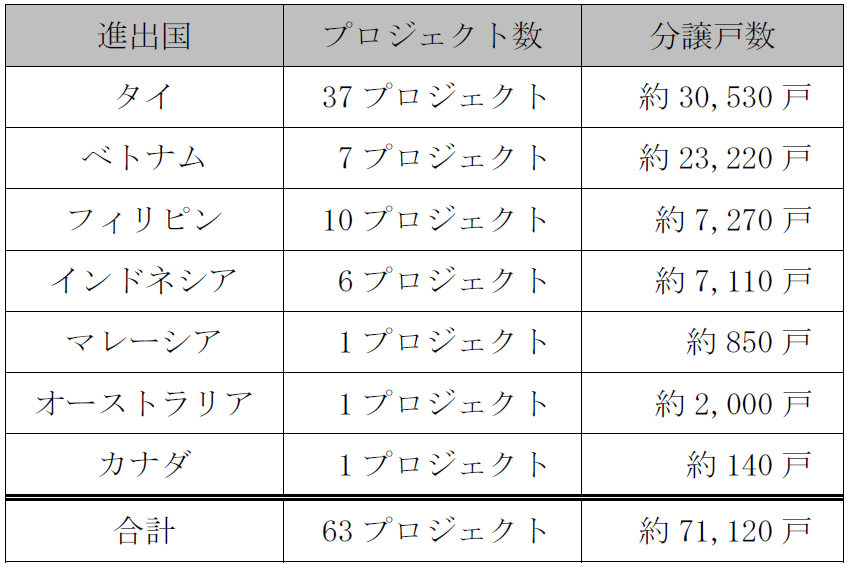 当社では現在ASEAN諸国を中心に海外における不動産事業を強化すべく、さまざまな取組を進めています。そのうち住宅分譲事業は、これらのプロジェクトへの参画により総計63プロジェクト(約71,120戸)となります。