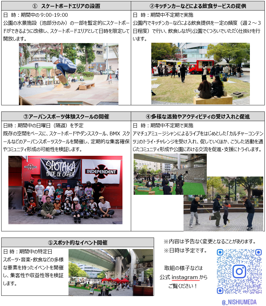 一般社団法人西梅田地下道管理協議会は、大阪市が実施する「官民連携よる西梅田公園の活性化に向けたトライアル実施付きマーケットサウンディング(市場調査。以下、「TMS」という。)」に参加し、9月1日(月)から11月30日(日)にわたり、『西梅田公園』における実証実験「Re:EDGE PARK Nishi-Umeda」を行います。