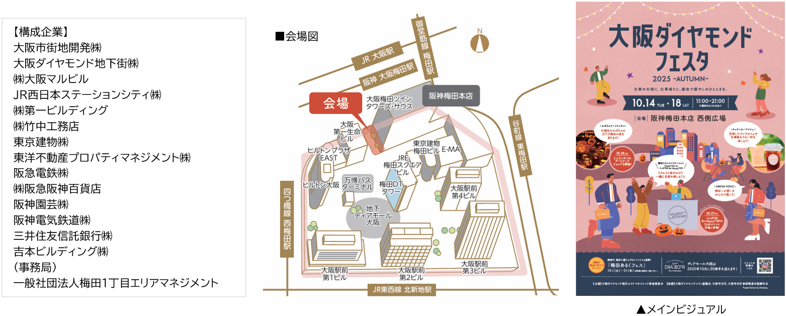 大阪ダイヤモンド地区エリアマネジメント推進委員会(※)では、JR大阪駅南側の大阪ダイヤモンド地区の公共空間を活用したエリアイベント「大阪ダイヤモンドフェスタ2025~Autumn~」を10月14日(火)~18日(土)に開催します。