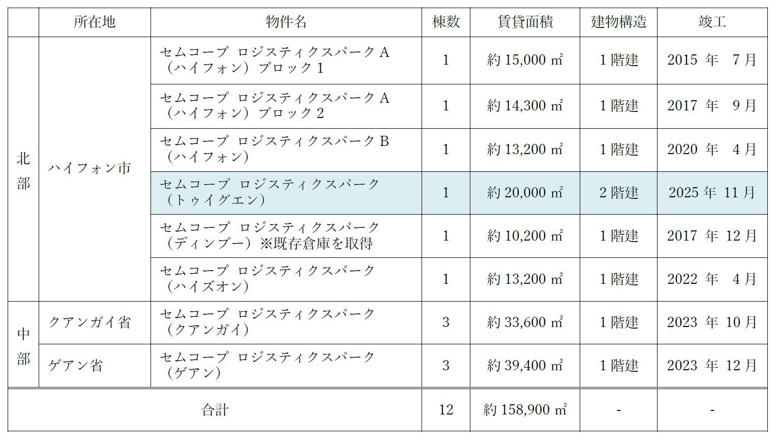 本物件の竣工により、ベトナムにおいて竣工済の物流不動産は、北部ハイフォン市内の6棟と中部の6棟(クアンガイ省内及びゲアン省内の各3棟)を合わせて計12棟・総賃貸面積約16万㎡※2となります。