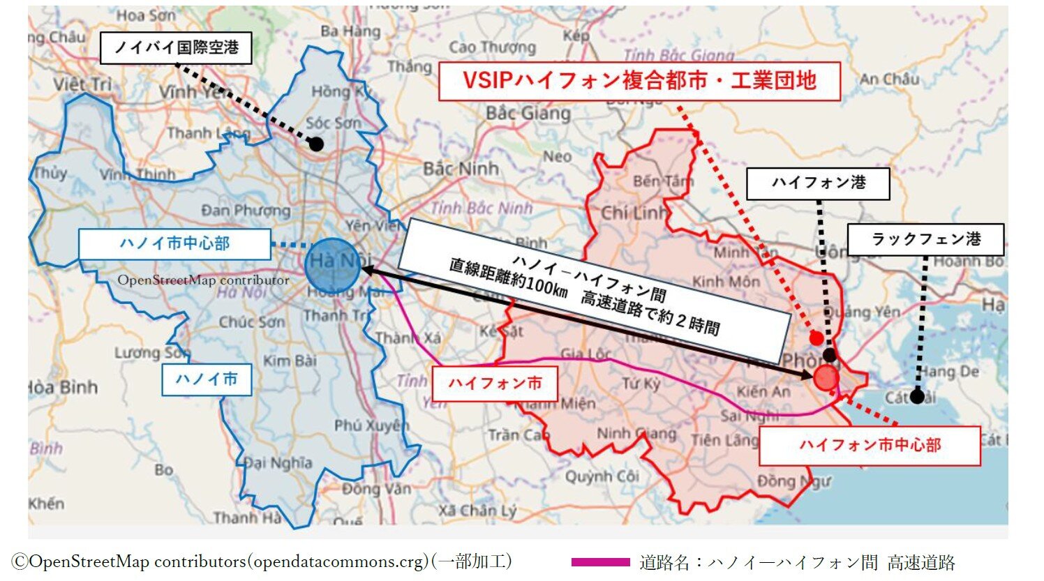 本物件は、ベトナム北部最大の港湾都市ハイフォン市のVSIPハイフォン複合都市・工業団地内に位置しています。同市は港や空港にも近接しているほか、首都ハノイ市と主要幹線道路で結ばれており、アクセスが優れていることから、広域物流拠点として高い優位性を持つ立地です。