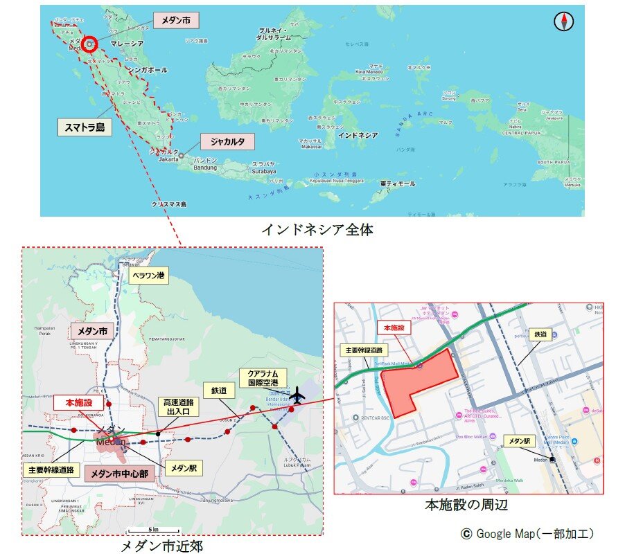 本施設は、インドネシアのスマトラ島における最大都市であるメダン市の中心部に位置しています。北スマトラ州の鉄道網における拠点駅であるメダン駅に近いほか、クアラナム国際空港やベラワン港とメダン市中心部を結ぶ高速道路につながる主要幹線道路沿いという、交通至便なロケーションにあります。また、オフィスや大学、分譲住宅などからなる大規模複合開発施設『ポドモロシティ・デリ・メダン』の中にあることから、同施設のオフィスワーカーや居住者はもちろんのこと、近隣のみならず遠方からも、幅広い層のお客様にご利用いただいています。