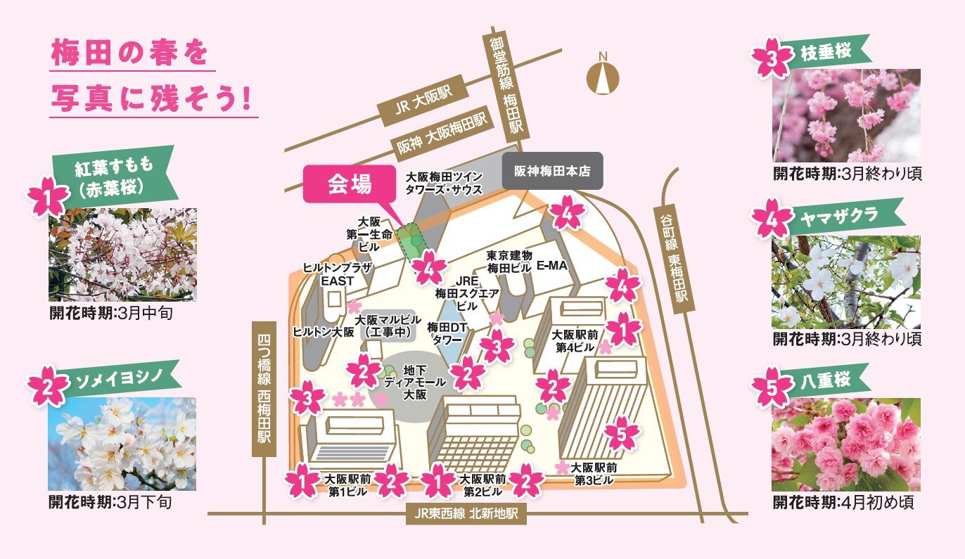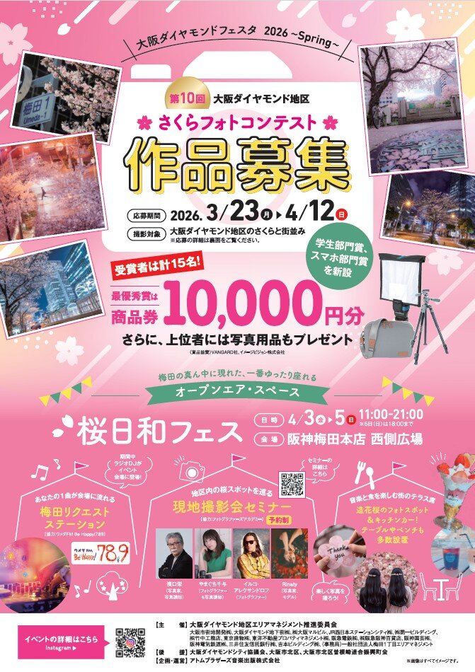 期間中、大阪ダイヤモンド地区を桜の名所に育てるべく 、「第10回 大阪ダイヤモンド地区 さくらフォトコンテスト」を開催します。 10年目の節目を記念し、通勤・通学途中の1枚でも応募可能な「スマホ部門」「学生部門」を新設しました。普段は地下を移動されている方々にも、この機会に地上を歩いてもらい、この地区の新たな魅力を感じていただきたいと考えています。応募いただいた作品は、主催者と特別審査員が審査し、入賞者には素敵な賞品をご用意しています。