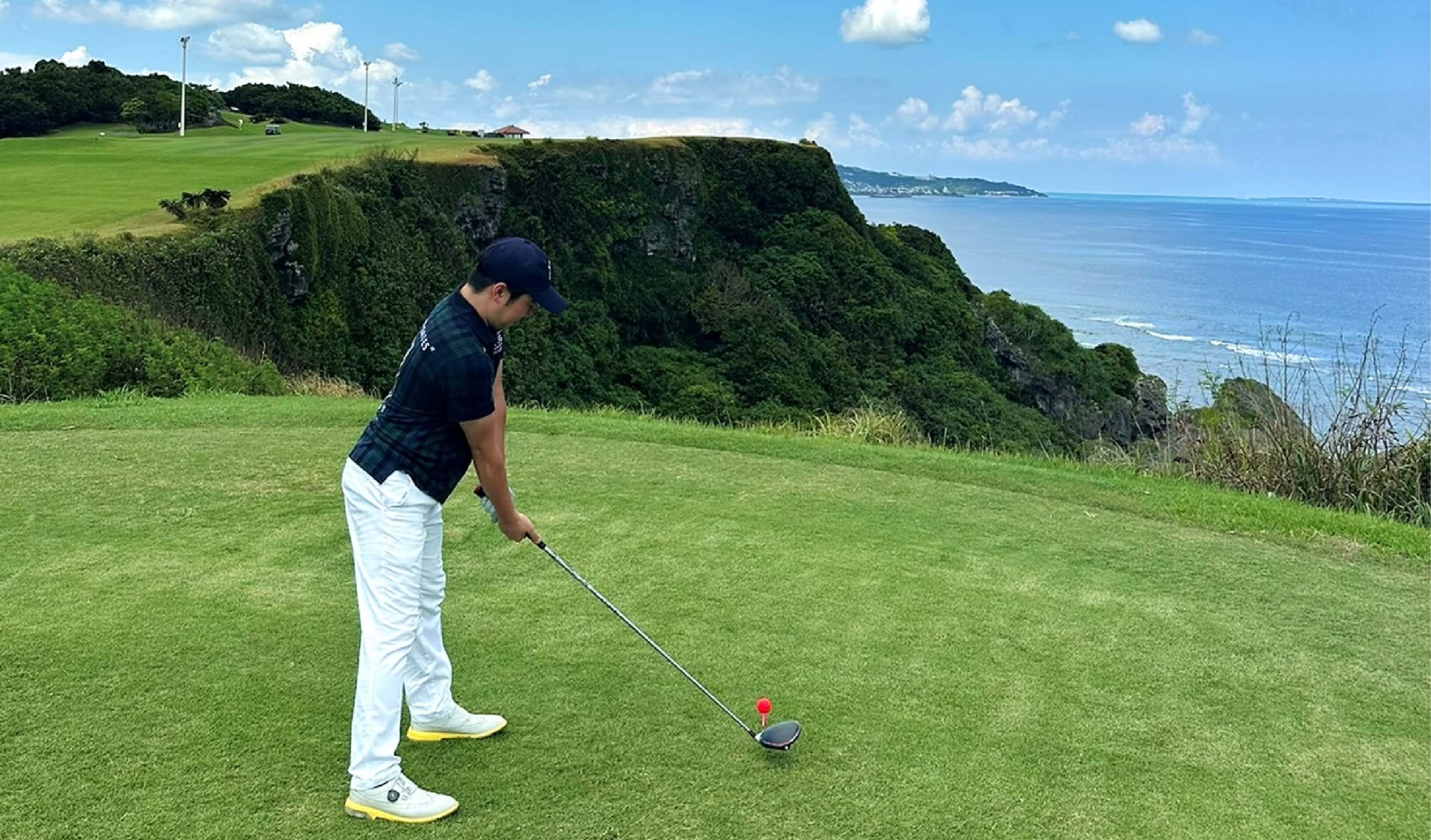 休日はゴルフをしたり、買い物をしたり、友人と食事をしたりと、さまざまな過ごし方をしています。また長期休暇の際は、よく旅行へ出かけます。写真は、友人と沖縄でゴルフを楽しんでいるときの一枚です。シーサイドコースでの海越えショットは最高でした。思いっきりリフレッシュし、仕事への活力を得ています。