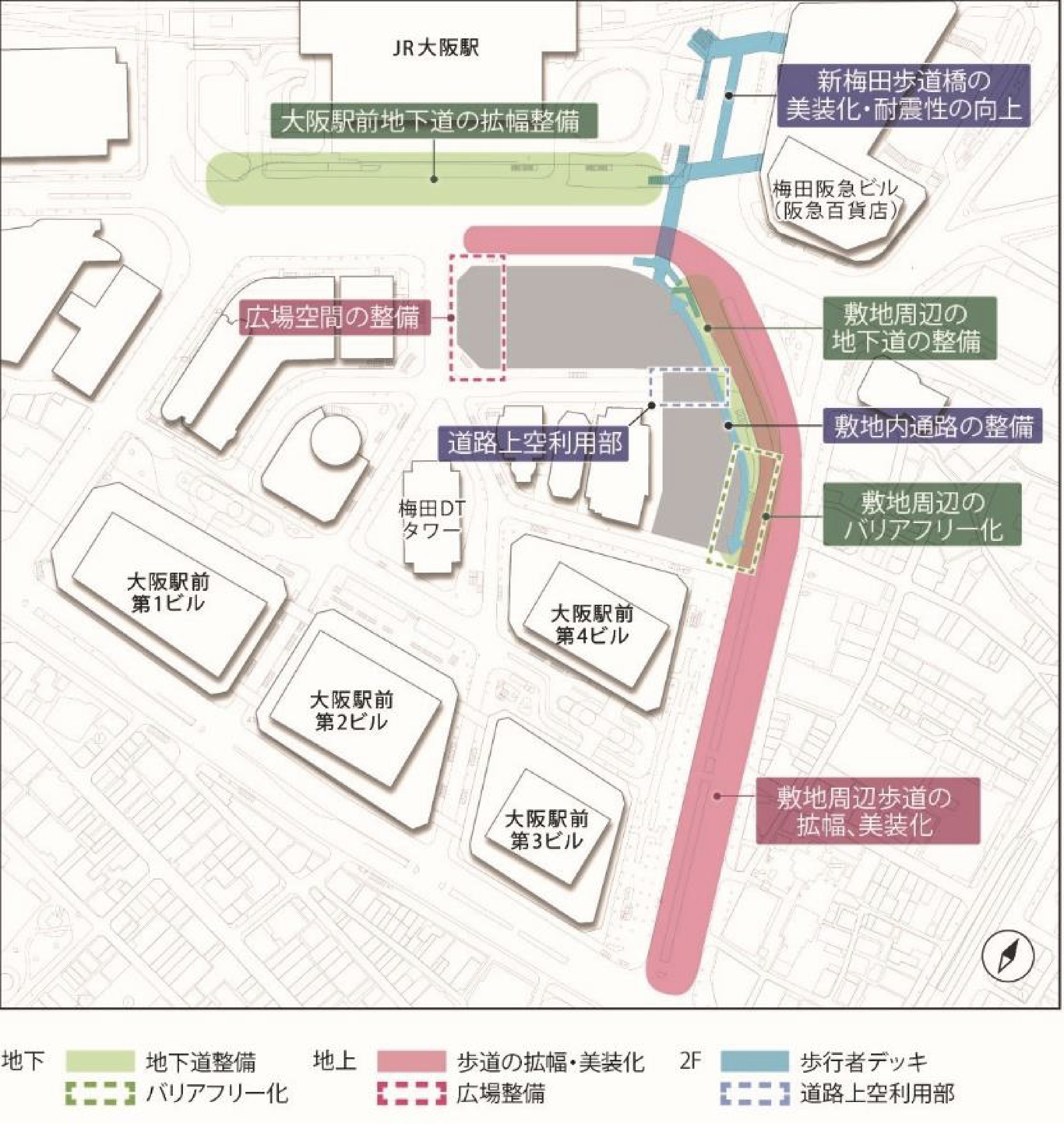 「大阪梅田ツインタワーズ・サウス」プロジェクトの検討が開始されたのは2006年。ビルの名称が決まるまでは「梅田1丁目1番地計画」として、阪急阪神グループの最重要拠点である梅田エリアの価値向上に向けた重点施策の一つでした。本プロジェクトで目指したのは、大阪神ビルディング・新阪急ビル間の道路上空を活用したビルの建て替えと周辺公共施設整備を一体的に行うことにより、都市機能の高度化や防災機能の強化、公共的空間の創出、良好な景観の形成などを図り、国際競争力の強化に資する快適で質の高いまちづくりを進めること。2012年に全面開業した梅田阪急ビル(現在の大阪梅田ツインタワーズ・ノース)、2013年にまちびらきを迎えたグランフロント大阪に続く大規模プロジェクトとなるだけに当社グループ内外からの期待も高く、構想から16年、工事着工から8年という長い時間をかけて阪急・阪神の双方でたくさんのメンバーが関わってきました。
