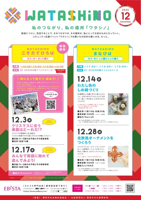 【お知らせ情報-エビスタ西宮】12/3・14・17・28 イベントを通じて繋がるコミュニティ応援イベント「ワタシノ」で、親子で楽しめるワークショップや、子育て応援イベントを実施します。